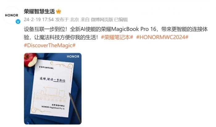 荣耀AIPC要来了!2月19日,荣耀官微正式宣布,在即将举行的MWC2024大会上将正式发布旗下首款AI PC——荣耀MagicBook Pro 16,从官微配图 “连接,就该一步到位”体现出,荣耀AI PC是AI全面使能多端生态,为用户带来一步到位的智慧AI互联使用体验。