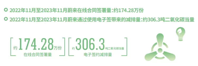 据《2023年签约减碳与低碳办公白皮书》所示,2022年11月至2023年11月蔚来在线合同签署量约174.28万份,累计减少约306.3吨二氧化碳当量的碳排放。
