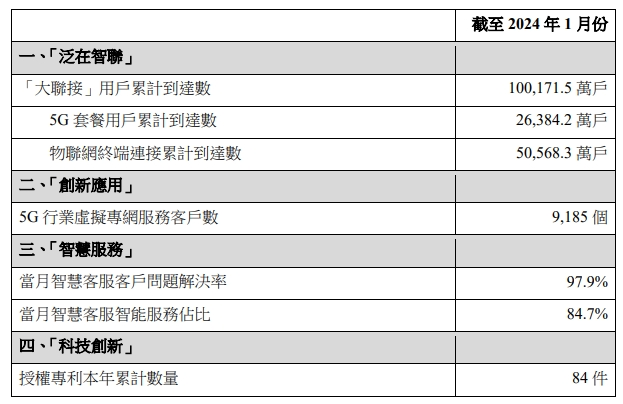 数据显示,截至2024年1月份,中国联通“大联接”用户累计达10.01715亿户,物联网终端连接累计达5.05683亿户,5G行业虚拟专网服务客户数达9185个,当月智慧客服服务问题解决率达97.9%,当月智慧客服智能服务占比达84.7%,授权专利本年累计数量达84件。