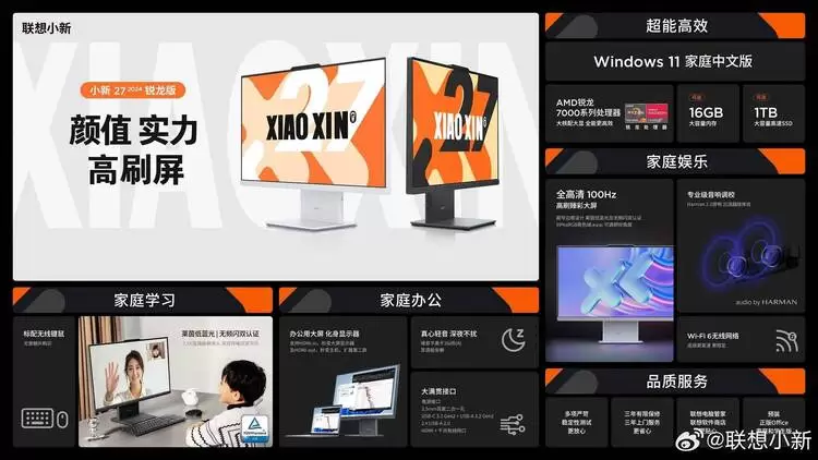 小新27 2024一体电脑锐龙版更新外观,采用27英寸 FHD 100Hz全面屏,哈曼2.0音箱,优化静音体验,在性能模式下噪音最高为26dBA,相比于上一代产品降低了7dBA。