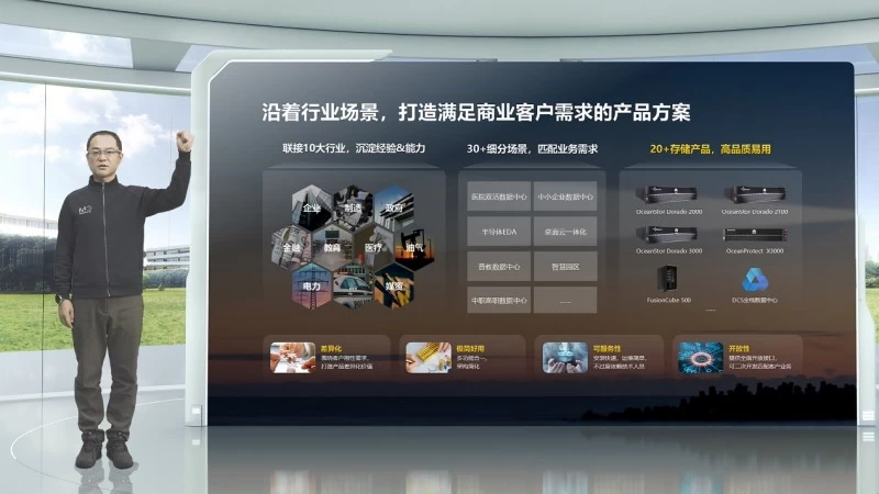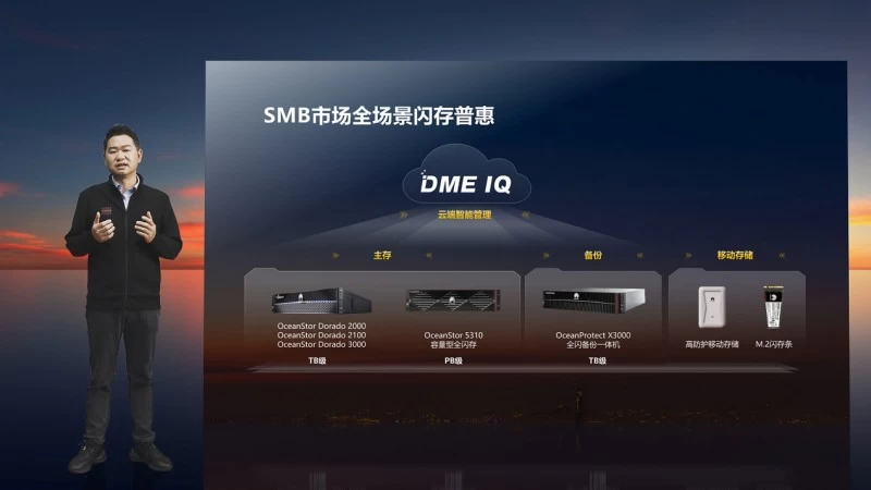 华为闪存存储领域副总裁汪小贵发布了业界最具性价比的全闪存存储新品,通过高效协同的产品组合方案,确保客户业务安全高效,真正做到全场景闪存普惠。新品包括专注于非结构化数据的业界首款A-A架构入门级全闪NAS存储OceanStor Dorado 2100 、能力全新升级的SAN存储OceanStor Dorado 2000、支持SAN&NAS一体化的OceanStor Dorado 3000;面向大容量全闪需求和备份场景,华为也推出了容量密度达1.5PB/2U的OceanStor 5310容量型全闪存、业界首款A-A架构入门级全闪备份一体机OceanProtect X3000;同时发布存储“AI大脑”——云端智能管理平台DME IQ,带给客户全新的智能化运维体验。