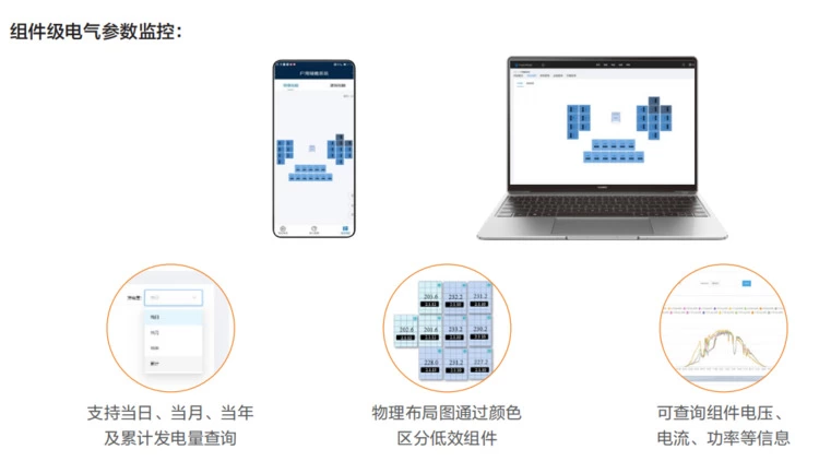 配置优化器的光伏系统从传统的组串级监控升级为组件级管理。通过华为优化器,可实时监控每块组件的运行数据,通过显示界面直观显示组件物理位置,优化器输入电压电流,输出功率,运行状态等信息,这些数据信息可通过网管、APP等方式访问电站来查看,支持查看实时数据和历史数据。