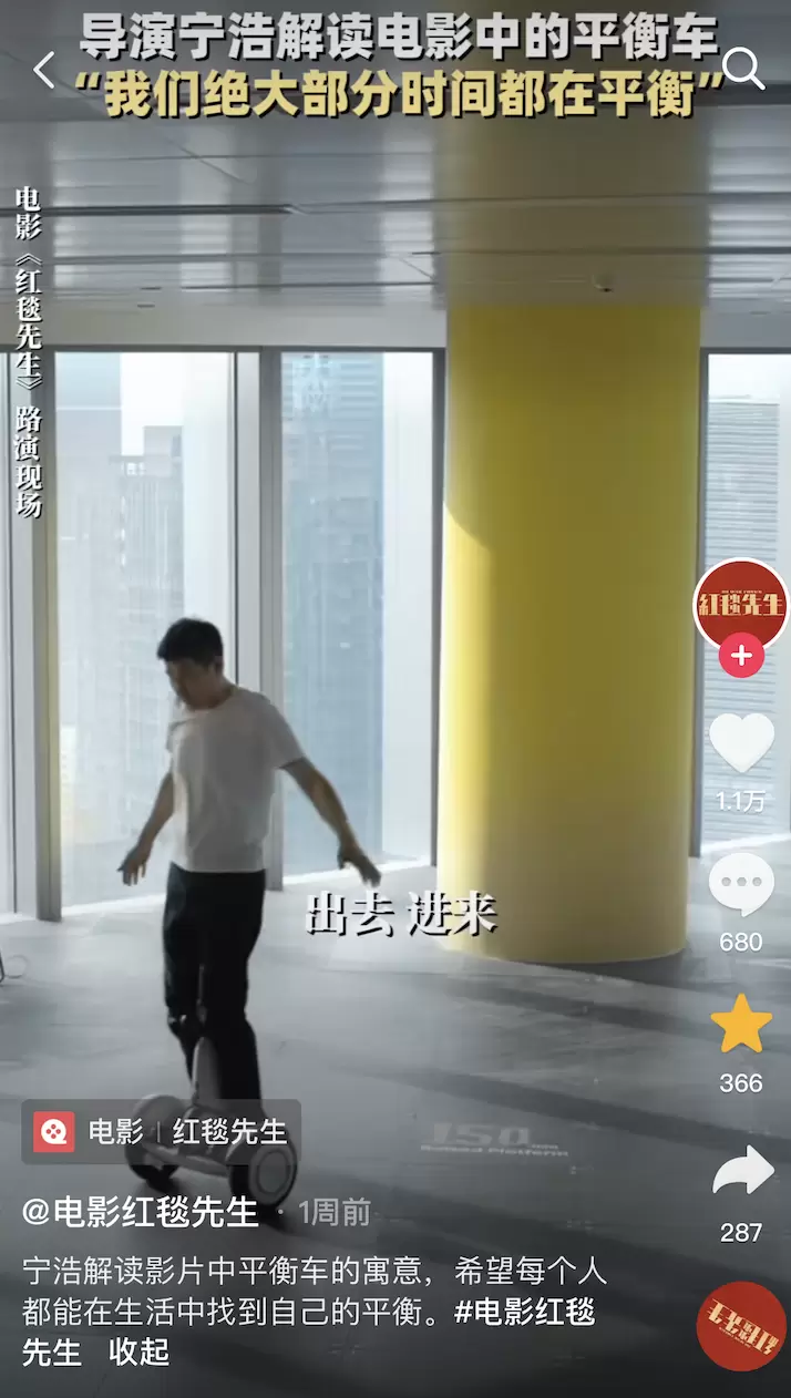 宁浩导演的新作,由知名艺人刘德华主演的《红毯人生》中,影片中,演员骑着九号平衡车练习如何使用,如何驾驭这辆新奇的出行工具。宁浩在解读影片时表示,他希望通过平衡车来表达一个理念——在纷繁复杂的生活中寻找自己的平衡点。