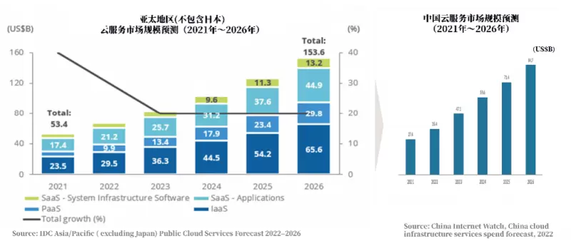 近年来,全球云服务市场持续高速增长。据数据统计,IaaS/PaaS/SaaS在亚太地区(不包括日本)的市场规模到2026年预计将扩大到1,536 亿美元。仅在中国,2026年的市场规模也预计将扩大到 847 亿美元,约为 2021 年市场规模的三倍。