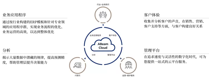 ABeam能够提供一个高附加值的商业平台——ABeam Cloud(德硕云),该平台活用ABeam在全球积累的深厚行业管理咨询经验及新型数字技术,降低各行业面临的挑战,助力客户实现业务改革和加快经营决策。