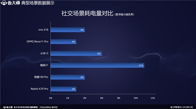 测试结束,从这一阶段各机的耗电量可以看出,社交场景是一个相对轻载的运行场景,六部手机中,只有魅族21的掉电量有些异常,竟然耗电11%,其他5部手机只消耗了3%-4%左右的电量,这也为最后的结果埋下了伏笔。