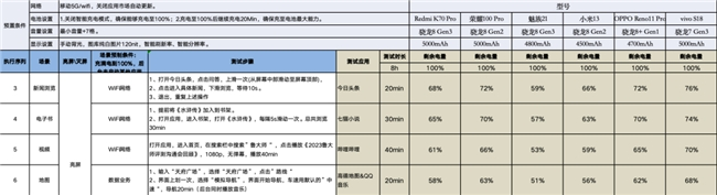 将在测试中运行微信、QQ音乐、抖音、今日头条、七猫小说、哔哩哔哩、高德地图、王者荣耀、淘宝这些应用,在历经全程8小时的测试流程后,最终以剩余电量的多少,裁定哪部参与测试的手机理论续航时间更长。
