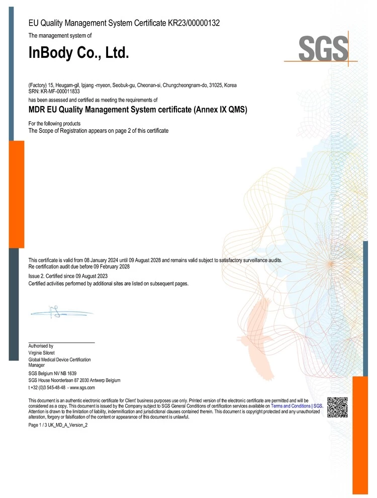2024年1月8日,InBody旗下自主研发的系列设备获得MDR欧盟质量管理体系证书, 这意味着InBody产品将全面进入包括比利时、德国、意大利、法国等在内的27个欧盟国家,并顺利地从一个功能的基础设备发展成为医疗、营养、健身、康复等专业领域的标志性产品。