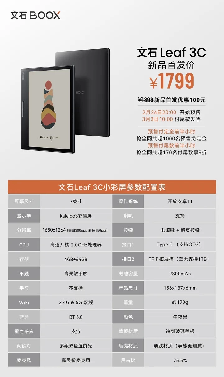 Leaf3C新品首发价格1799元,各大电商平台已经开启预定。作为2024开年墨水屏行业的第一款新品,对于喜欢彩色漫画阅读的墨水屏爱好者,的确是一款非常有诚意的作品,无疑是追漫爱好者的首选。