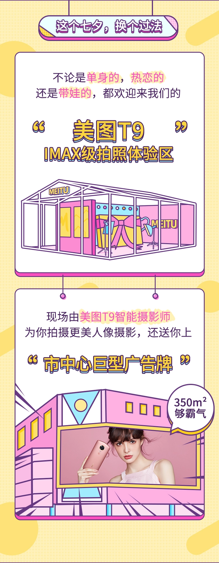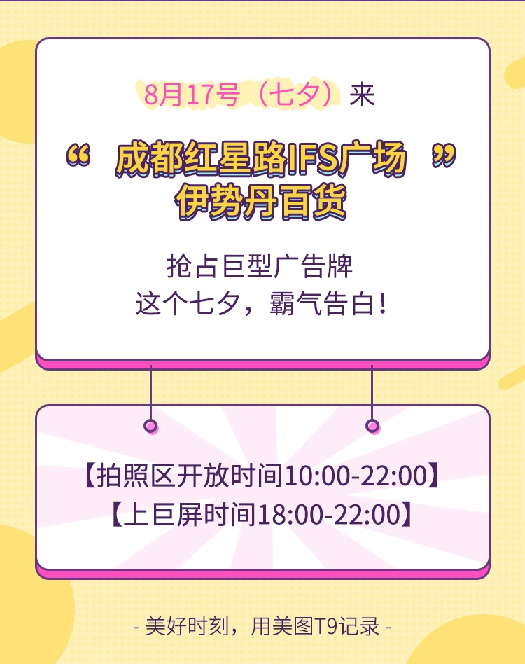 心动不如行动,现在就快和你的小伙伴们约起来吧!8月17日10点-22点,七夕相约成都红星路IFS广场伊势丹百货,美图T9 IMAX级拍照体验区,用美图t9拍人像大片,让更美的你登市中心巨型广告牌,让你们的爱高调出道!