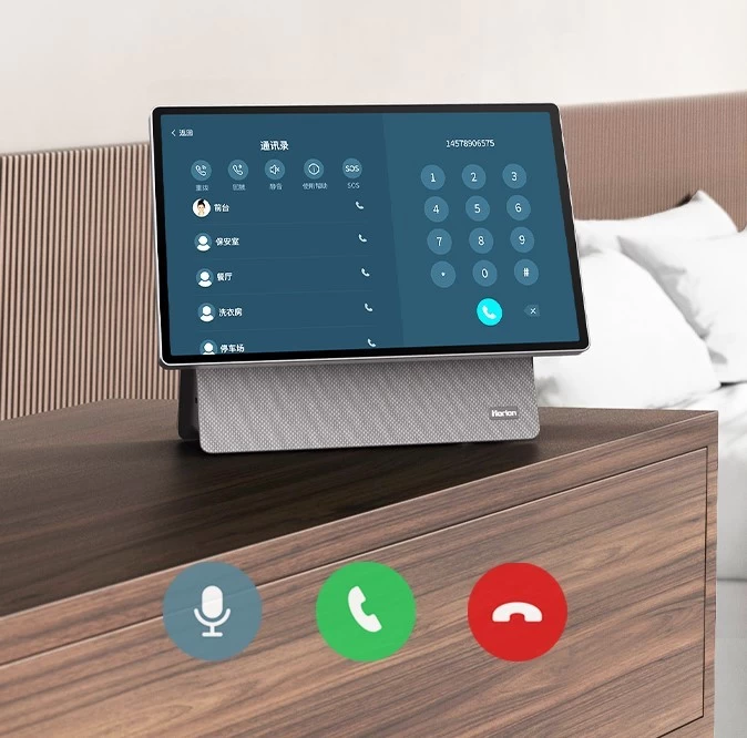 智能通话:皓丽酒店智显屏预留电话线接口,可兼容传统固化机,一键拨号,快速实现服务呼叫。补充用品、保洁服务、洗衣服务、意见反馈、维修服务……任何客需服务,一个电话高效便捷。