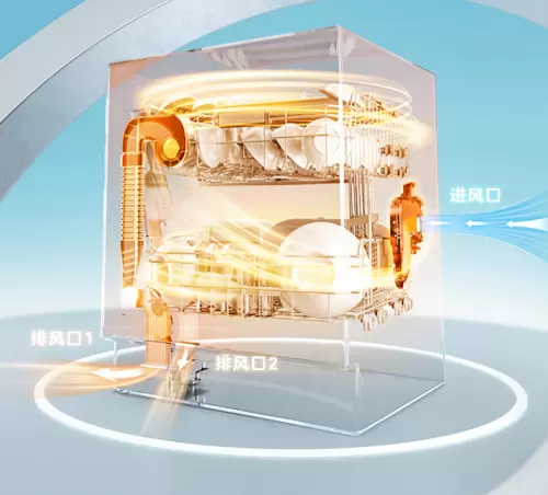 由于普通洗碗机洗完餐具后由于会有残留水,积水久置很容易返潮滋生细菌,导致腔内有异味、餐具二次污染等问题,危害用户饮食健康。美的晶焰洗碗机升级烘干技术,搭载PTC热风系统配合双排风风机,实现行业唯一“内腔全烘干”:即内门、背板、侧板、餐具全干,从此告别内腔和餐具返潮。