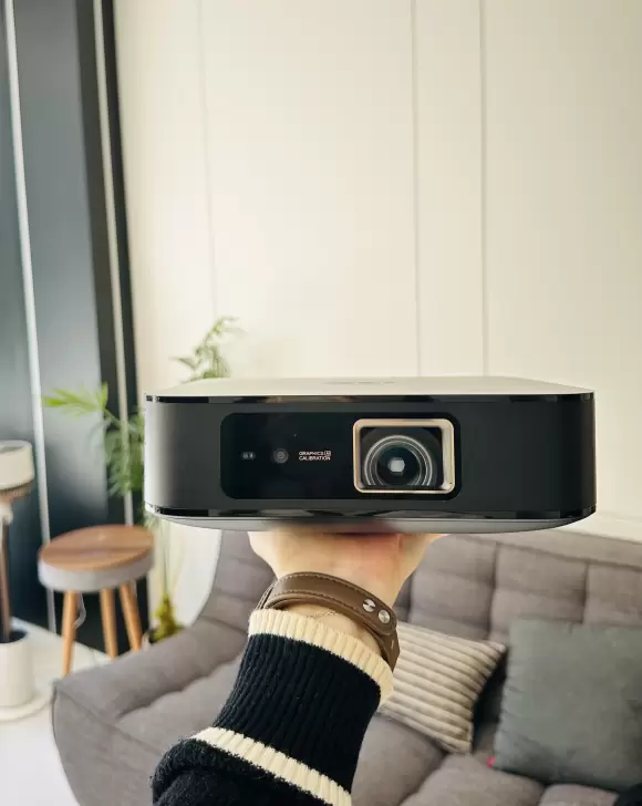大眼橙X7D Pro作为轻薄机中配置最高的,也是同价位配置中做到最轻薄的。它采用扁平化的外观设计,机身轻薄便携,大小近似一本书,轻松单手握持。其小巧轻薄的机身设计使得它能够灵活移动,无论是在客厅、卧室还是书房,都能轻松投影,甚至可以随身携带出门露营。