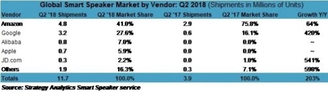 据外媒报道,市场研究公司Strategy Analytics的最新报告显示,一手开辟智能音箱市场的亚马逊至今仍然牢牢地占据着市场统治地位。但是,在第二季度,谷歌Home智能音箱的增长速度非常惊人,甚至远远超过了市场霸主亚马逊。