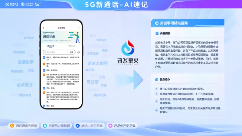 在演讲中,江涛详细介绍了“AI速记”这一创新应用。搭载讯飞最新发布的星火语音大模型,可在工作通话中实现语音转写成文字记录、精准提炼内容摘要和待办事项,在通话结束后通过短信实时推送给用户。不受终端机型限制,所有手机均可支持,解决重要通话沟通时间长、交谈事项多、无法记录全的问题,助力工作电话效率提升。