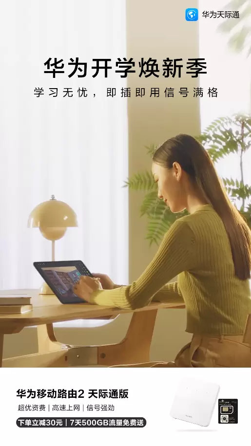 又是一年一度开学季,华为移动路由产品与华为天际通共同为学生群体打造了一系列开学福利,助力其轻松玩转新学期!华为移动路由系列产品立减20元起,下单后激活流量卡即可获得天际通500GB国内流量包,为莘莘学子提供了高速、便捷、高性价比的用网体验。