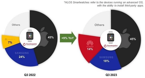 华为在高端市场的表现非常亮眼,根据Counterpoint最新报告显示,2023年Q3全球智能手表市场份额,华为出货量同比增长56%,以14%的市场份额位居全球第三,其中华为高端智能手表第三季度全球出货量增幅高达122%。今年1月,根据Counterpoint Research公布的信息显示,2023年全球高端手机市场(平均批发价超过600美元),华为同比增长两个百分点,以5%的市场份额排名全球第三名。