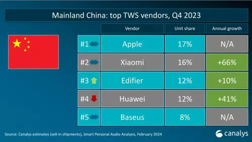 TWS市场观察:Canalys 2023年Q4 数据发布,倍思以8%占比强势进驻前五