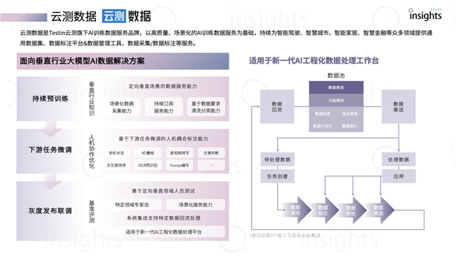 云测数据先后推出了“云测数据标注平台”、“AI数据集管理系统”、“面向垂直行业大模型数据解决方案”等技术成果。通过结构创新、智能化、工程化、标准化的标注平台产品赋能AI训练数据行业,助力企业AI数据训练综合效率提升200%、标注精准度最高达99.99%,显著提升Al应用的规模化落地效果。其中,云测数据面向垂直行业大模型的数据解决方案可为行业大模型提供从持续预训练、任务微调、评测联调测试到应用发布的全生命周期的高质高效数据,帮助垂直行业企业更好地落地大模型相关算法应用。