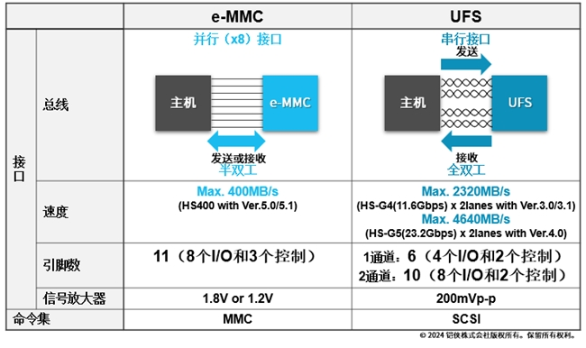 例如相对e-MMC,UFS在传输速率上更具备优势,它使用串行接口,支持全双工通信,即可以同时执行数据读取和写入。早在2020年,UFS 3.1就实现了2,320MB/s的传输速度,UFS 4.0更是将这一数值提升到4,640MB/s。这意味着UFS更适合用来实现诸如ADAS等高阶智能驾驶辅助系统的应用。