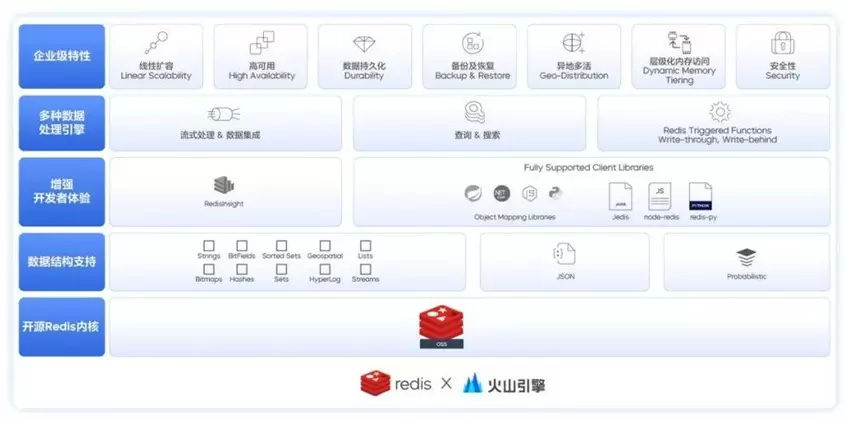 本次合作推出的火山引擎缓存数据库Redis企业版,不仅提供内存向量检索、AI算法内存计算、多模组扩展(Redis Modules)、层级化存储、持久化存储、触发器及函数、流库一体化等高级功能,同时性能和稳定性保障能力均有大幅提升,在应对向量检索、JSON、概率化数据、空间地理信息及时序数据检索和自定义函数方面更具优势。产品具备五大核心特性: