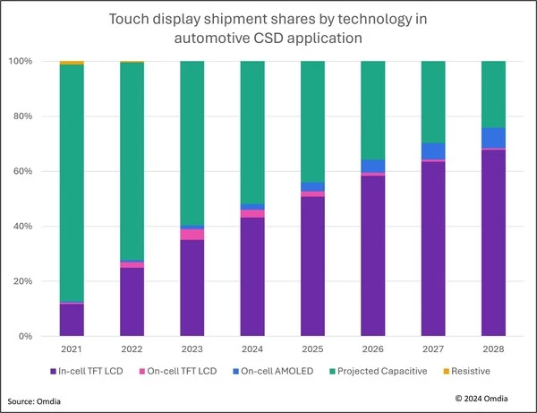 Omdia:内嵌触控式TFT LCD显示屏将在汽车中控屏应用中成为主流,预计在2025年占出货量的50%以上