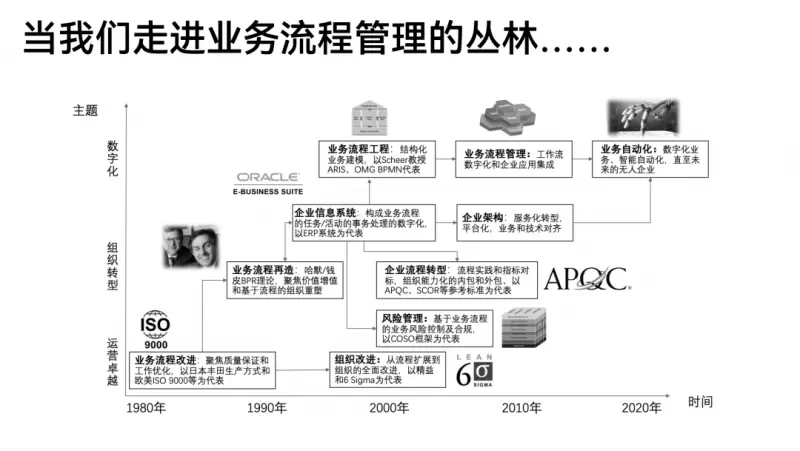 理清概念及其结构之后,果总以「业务流程管理思想的沿革和发展」为引,辅以大量经典案例,将大家带到“方法”的世界当中。