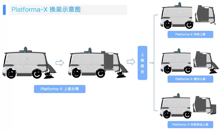 仙途智能凭借共享自动驾驶底盘Roboard-X强大的通用性和灵活性,Platforma-X在环卫场景实现了一车多用的创新理念。Platforma-X采用“1个底座+3个上装”的创新产品形态,上装为模块化设计,通过配套工作基站,车辆可以快速实现底盘和上装的分离、组合。通过搭载不同种类的上装,车辆可快速变换成清扫、洒水和垃圾转运三种环卫车型,灵活覆盖多种保洁任务,即换即用。相比分别购置3种车型,Platforma-X能够帮助运营方节约50%的购车成本,同时无驾驶室无司机以及自动充电加水的产品设计,更让司机和充电加水的人工成本降低至0。对于终端用户而言,Platforma-X可使综合成本下降高达近70%,实现“1大于3”的应用效果,从根本上突破了无人驾驶环卫车规模化落地的成本困境,为无人驾驶环卫车的规模化落地扫清障碍。