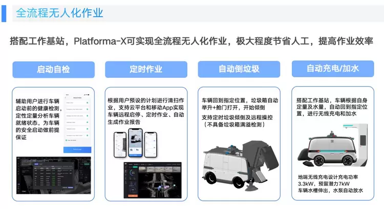 实现“一车多用+全流程无人化”两大创新的同时,Platforma-X的清扫能力同样具备竞争力。车辆配备700L超大垃圾箱和240L清水箱,是同类自动驾驶清扫产品的2~3倍,可实现2~4倍于竞品的作业效率;以更为先进的吸扫模式替代行业普遍采用的传统滚扫模式,清扫洁净率大于95%。得益于小巧的机身设计,Platforma-X不光适用于园区、厂区、停车场、住宅小区等中小型场景,在城市人行道、非机动车道、主干道和广场、交通枢纽等中大型场景亦有不俗的表现。