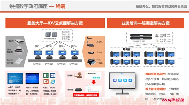 数字政府建设的核心问题,正在由如何“建”变为如何“用”,办公新桌面如何满足办公、服务大厅、业务培训等多个场景所需。锐捷推出办公桌面云方案,让政务办公桌面外设兼容性更好、业务应用融合性更优、窗口集中管理更便捷。好用、易管理的云桌面让政府客户更满意,引领政务办公新风向。