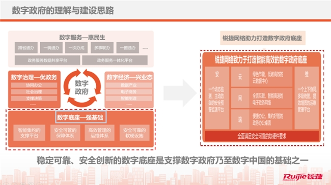 锐捷网络认为,建设数字中国是数字时代推进中国式现代化的重要引擎,是构筑国家竞争新优势的有力支撑。数字政府是实现数字中国的关键一环,“数字政府”的建设就是在集约、安全可靠的基础设施底座之上,进行数字治理、数字服务和数字经济的深化和强化,从而实现整体协同、运行高效、服务精准和管理科学的政府数字化转型升级。其中,数字底座作为整个数字政府的关键基础设施和支撑保障,其智能化、创新水平、安全保障和运维管理能力是当前阶段优先需要考虑的重要内容。