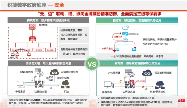 锐捷网络通过“端网云安维”五个层面的能力建设,致力于打造智能高效的数字政府底座。“端”是指便捷办公、集约好管的政务办公桌面,“网”是指一张全面互联、智能高速的电子政务网络,“云”是指一个绿色节能、低碳高效的云数据中心,“安”是指一个动态监测、主动防御的安全预警监测平台,“维”是指一个上下协同、多级统管、提效增质的运维管理平台。