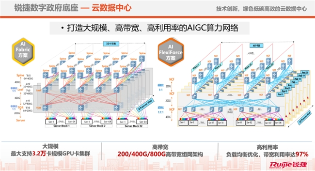 近年来,火热发展的AI成为推动政府治理现代化的重要力量。AI技术应用的同时也对运算能力和数据处理能力提出了更高要求,传统集中式部署的框式网络方案业务流量访问路径长、时延高、扩展性差、能耗高等短板问题愈发明显。锐捷网络AIFarbic、AIFlexiForce创新解决方案应运而生,通过采用创新分布式去框组网架构大幅提升网络可靠性、扩展性的同时实现端到端路径最优、降低60%时延,超宽无损转发0丢包;创新的CPO技术、NPO+冷板式液冷技术、浸没式液冷技术应用更是可将单机功耗降低30%,实现高性能和低能耗的更佳平衡,打造绿色节能、低碳高效的云数据中心。