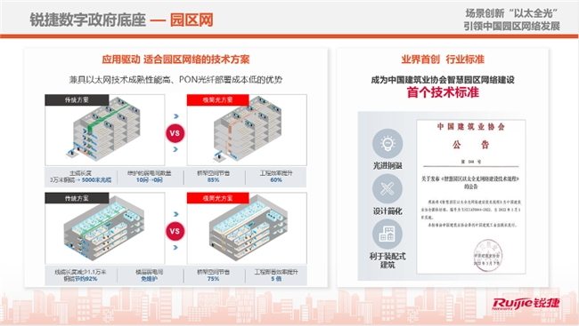 在后疫情时代,政务在线业务量和多业务模式使得用户对于网络升级的诉求愈加强烈,光在园区网应用的需求也真正到来,光进铜退势不可挡。锐捷推出了极简以太全光网解决方案,通过全新光纤入室的部署方式,结合以太网,通过架构简单的组网和SDN技术,兼具以太网技术成熟性能高、PON光纤部署成本低的优势,为园区业务提供面向高带宽、低延时、高度灵活、极简运维的网络承载,是更适合园区网络的技术方案。2022年3月,锐捷作为目前唯一主编厂商参与中国建筑业协会首个关于智慧园区网络建设的标准化文件制定。同时,锐捷极简以太全光网解决方案获得“2022-2023数字城市/应急管理信息化方案案例创新类(IT企业)”。