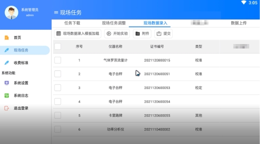 现场计量人员在系统中完成现场计量项目、计量结果的录入,包括现场环境参数、所用仪器设备、计量人员、计量结果等相关信息。