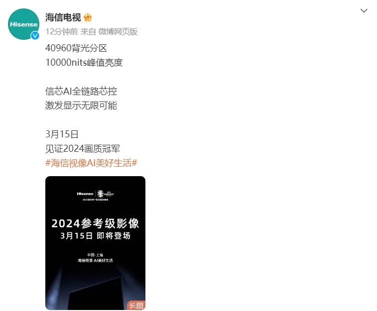 据悉在3月15日的海信电视2024春季新品发布会当天,还会有UX、U8、U7、E5等系列的全新产品发布,感兴趣的记得到时关注。