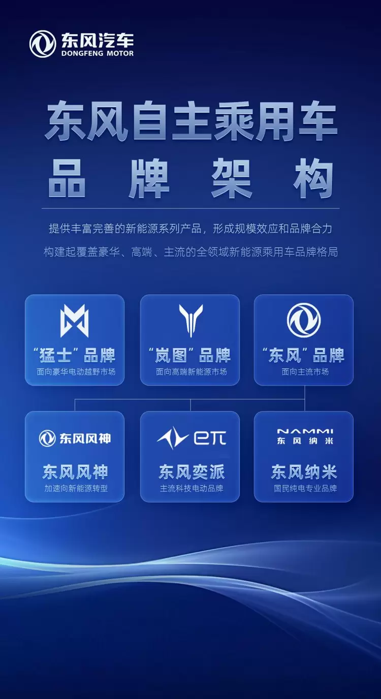 在科技跃迁成果的推动下,东风加速品牌跃迁、产品跃迁和价值跃迁。目前,东风已构建起覆盖豪华、高端、主流的全领域新能源品牌格局,包括面向豪华的“猛士”、面向高端的“岚图”、面向主流的“东风”品牌,各品牌针对不同细分市场,传递各自品牌主张和价值,新能源品牌格局体系力初显。