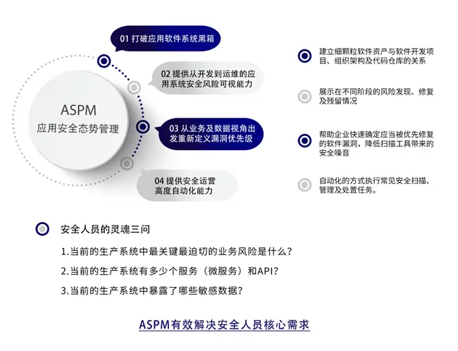 应用安全态势管理(ASPM)是一种从应用程序开发到生产的全生命周期中管理应用安全的技术手段,可在应用程序的全生命周期中识别、确定漏洞优先级并对其进行修复。ASPM通过综合评估风险、影响和合规性因素来全面了解企业的应用程序安全状况,帮助企业在尽量少干扰业务的前提下,降低应用安全漏洞及数据泄露风险。
