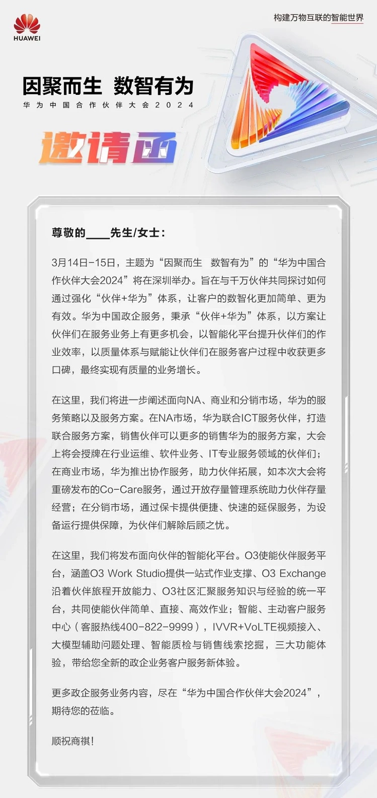 3月14日-15日,主题为“因聚而生 数智有为”的“华为中国合作伙伴大会2024”将在深圳隆重召开,届时,华为政企服务将重点展示在服务体系建设、联合服务方案打造、智能化平台改造等方面的全新进展,重磅发布O3伙伴服务工作台与O3伙伴服务能力市场,与伙伴一道持续打造品质服务。在本次大会的“品质服务”展区,伙伴们可以现场体验智能化客户服务中心带来的全新客服务新体验。
