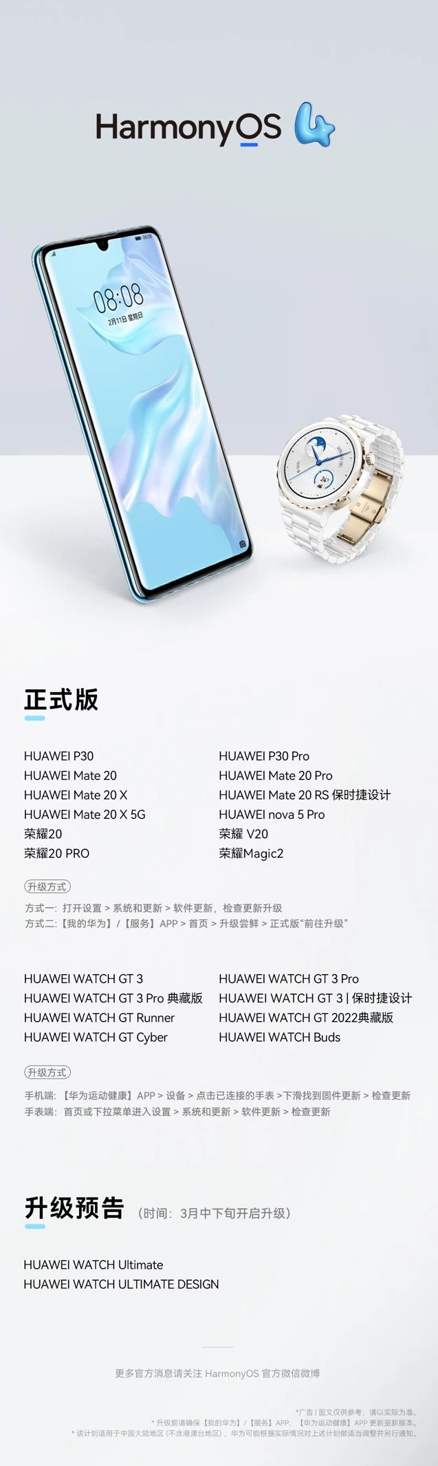 手持HUAWEI P30、HUAWEI Mate 20等老机型用户,可尝试通过设置>系统和更新>软件更新,检查新版本升级,或者通过【我的华为】/【服务】APP>首页>升级尝鲜>正式版“前往升级”路径检查升级,另手持HUAWEI WATCH GT3等8款穿戴设备的用户,也可根据上方图示升级路径操作系统升级,感受HarmonyOS 4带来的流畅性、智慧性与安全性。更多官方消息可持续关注HarmonyOS官方微信微博,了解HarmonyOS最新升级消息。