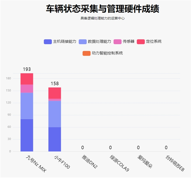 最终经过鲁大师智慧实验室的数据测评,九号Nz MIX以总分733分的优势排名第一,小牛F100和雅迪DN2分别以563分和178分的成绩位列第二、三名;绿源COLA9和台铃萌苏EB紧随其后,分别以175分及141分的成绩分列四、五名;爱玛爱朵由于智能化劣势,最终以126分的成绩排在第六位。作为九号新品,Nz MIX在稳住智能化配置优势的基础上,还增加了部分新功能,比如个性音效、应急骑行模式等等,搭配上九号自研的RideyLONG长续航系统使其以733分的成绩得到第一名。此外,九号Nz MIX的售价也进一步下探,这让新车有着不错的性价比。车辆状态采集与管理硬件排行榜在鲁大师电动车智能化测评体系中,智能化基础由车辆状态采集与管理硬件和车辆交互传输系统构成。