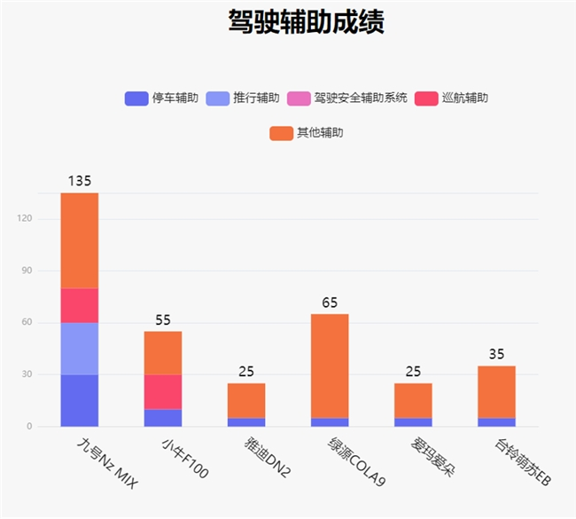 小牛F100的智能功能也相当丰富,通过蓝牙可与手机APP实现智能互联,但相比九号,小牛F100在车端的智能化表现较差,车辆无法通过传感器判定驻车信息,状态反馈也较为迟钝,实际使用体验相比九号要逊色一些。最终,九号Nz MIX在该板块得到最高的193分。驾驶辅助排行榜驾驶辅助方面一直是鲁大师电动车测评重点关心的领域,无论何时,安全始终是排在第一位,良好的驾驶辅助系统,可以帮助提升用户驾驶体验。