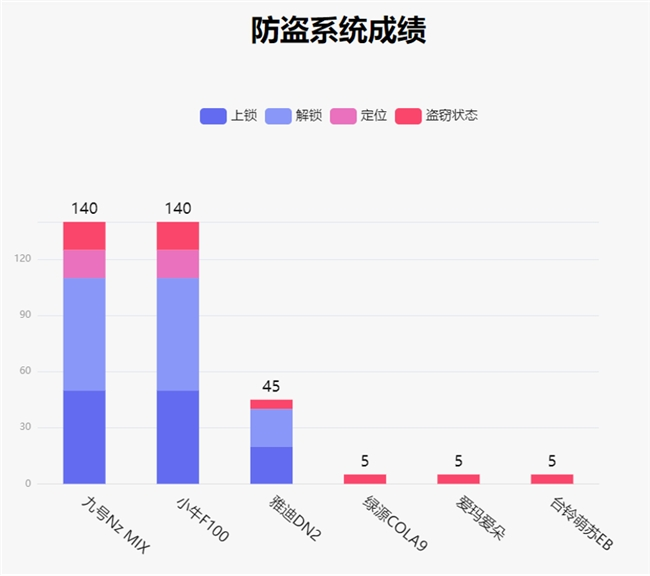 此外,小牛F100搭载了新一代睿电系统,可对车辆电池进行24项智能防护,并且能满足千次充放循环,整车续航可达到50公里。外沿能力测试,除九号Nz MIX外,绿源COLA9和台铃萌苏EB也配备了USB接口。防盗系统排行榜防盗系统领域从来不缺智能化,我们根据电动车智能状态当中的上锁、解锁、定位和盗窃状态、防盗设计等来测评车辆。