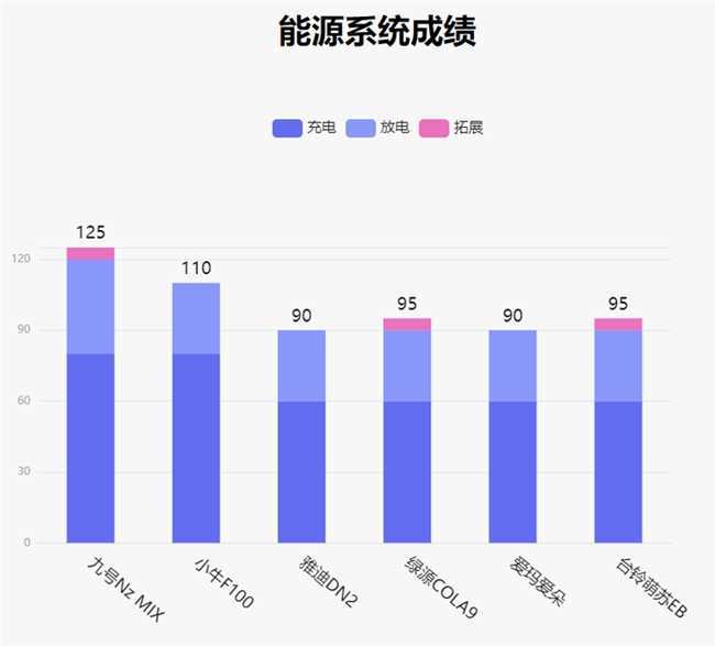 绿源COLA9在该板块测试中也有着不错的表现,加分项集中在刹车系统测试。新车采用陶瓷化复合材料刹车片,搭配了罗拉刹车抱闸系统,相比绿源此前的普通鼓刹,刹车距离可以缩短30%,整体刹车性能有了很大提升,65分的成绩要比小牛F100在该测试中的表现更为出色。能源系统排行榜电动车能源系统排行根据电动车智能状态当中的电池容量、充电时间、电池保护系统、能量回收系统以及外沿拓展能力实验室考核评分。