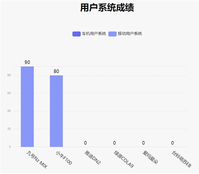 雅迪DN2的基础防盗性能不弱,但防盗方案较为单一。而绿源COLA9、爱玛爱朵及台铃萌苏EB使用的依然是传统报警防盗,使用体验较差,并且防盗性能也较弱。最终,九号Nz MIX和小牛F100都获得了140分,实际使用体验并无太大差别。用户系统排行榜用户系统由车机用户系统和移动用户系统两个板块组成,根据信息丰富程度和使用效率综合考量评分。