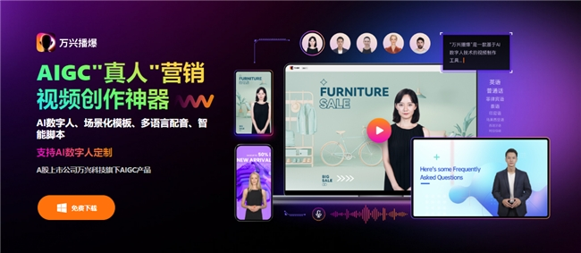 万兴播爆是万兴科技沉淀20年视频创意和出海实战经验,结合AIGC、数字虚拟人和短视频制作多元技术,打造的新一代出海营销神器,可有效解决企业出海时面临的外籍主播难找、多语言难适配、制作周期长、成本居高不下等诸多难题,为用户带来从脚本、到“真人”出镜、到视频自动生成的“全链路AIGC创作”体验。