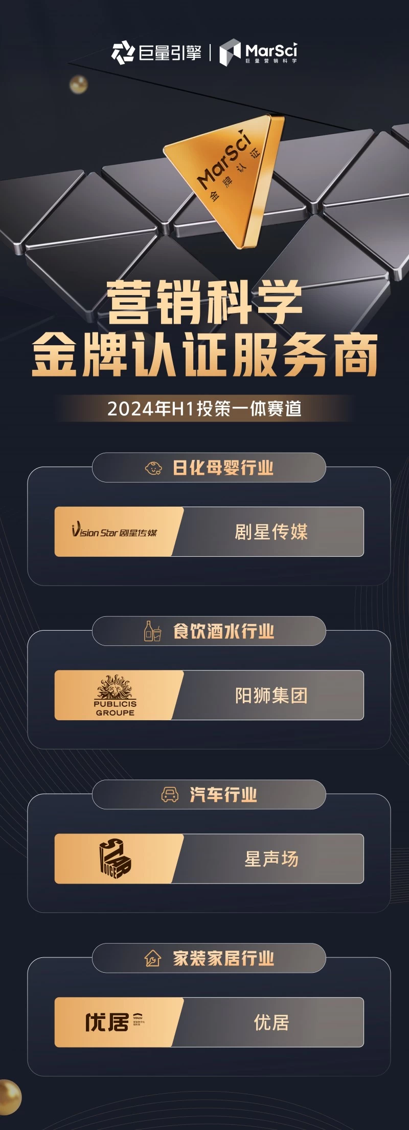 近日,2024年H1「投策一体」赛道金牌认证服务商评选圆满落幕,经过多轮的筛选和答辩,剧星传媒、阳狮集团、星声场、优居脱颖而出,成为第三批行业向金牌认证服务商。