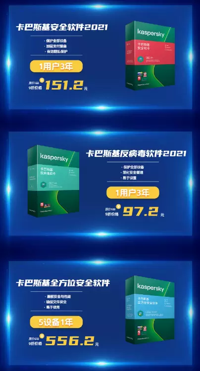 即日起至3月18日,凡在卡巴365官网购买卡巴斯基反病毒软件2021(1用户3年),卡巴斯基安全软件2021(1用户3年),卡巴斯基全方位安全软件(5设备1年)立享9折优惠。选择卡巴斯基杀毒软件,不仅是对您个人数据安全的投资,也是对家人和工作责任的体现。抓住这个机会,为您的数字生活加上一把坚固的锁。立即行动,享受卡巴斯基带来的全面保护吧!