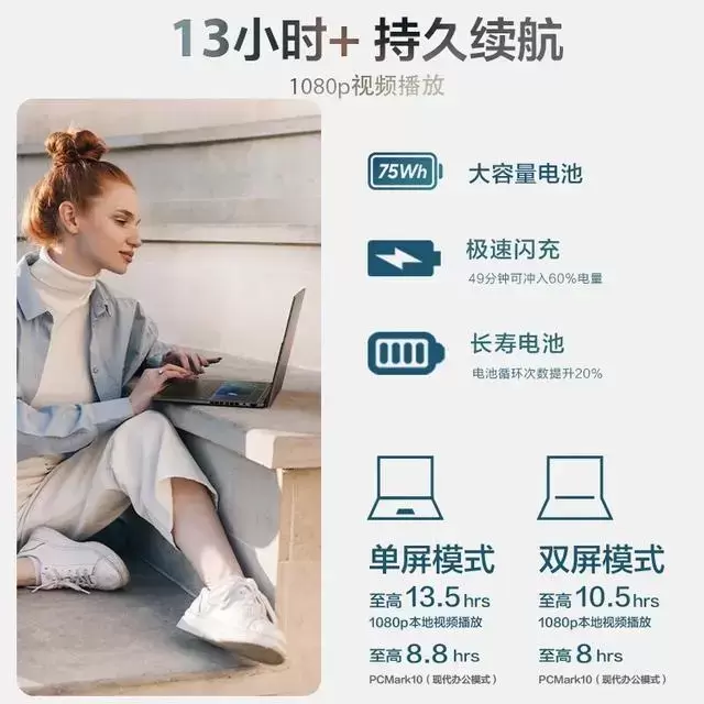 为了给打造更无忧、更具可持续性的工作状态,灵耀14 双屏还配备了75Wh大容量电池,单屏模式下,本地1080P视频播放续航至高可达到13小时以上,搭配49分钟充电60%的华硕闪充技术,完美解决工作、学习、娱乐时的用电焦虑。同时,包括双雷电4,USB-A大口,HDMI2.1TMDS,3.5mm音频口在内的全套高速接口,满足了连接各种外部设备的需求,并具备强悍的扩展能力。