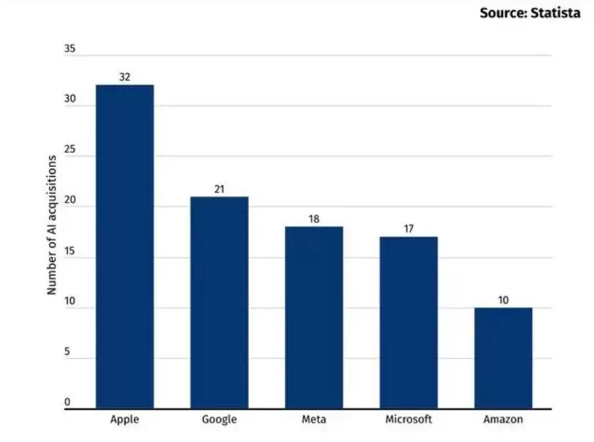 根据市场调查机构 Stocklytics 公布的最新报告,苹果在 2023 年共收购了 32 家 AI 公司,在主要科技公司去年收购相关公司数量上,位居榜首。